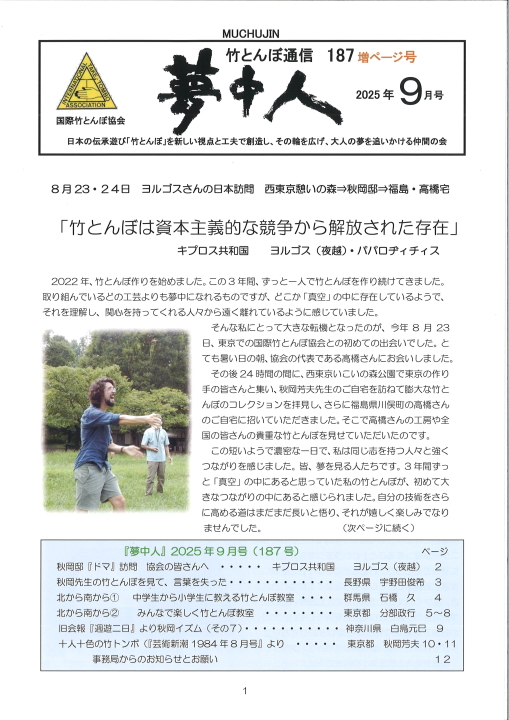 会報『夢中人』3月号(184号) 第41回全国竹とんぼ大会in長崎・平戸大会第40回全国竹とんぼ競技大会 純竹滞空優勝とんぼについて北から南から 島根から 兵庫から世界から ドイツから秋岡イズム(その4) など竹とんぼの話題が満載です。 会報『夢中人』3月号
